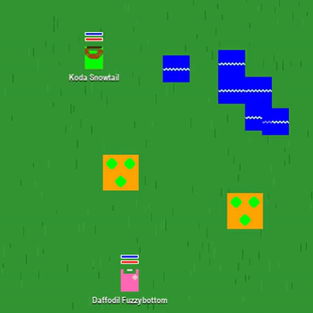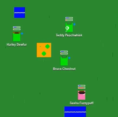 The simulation is built using Python and Pygame, and is designed as a self-contained environment where characters interact with limited resources and simple rules.